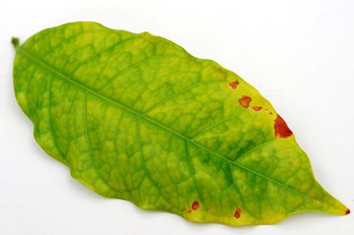 Hojas jovenes muestran clorosis amarillo-verdoso intervenal, posteriormente uniforme. Con deficiencia más avanzada, un toque de color anaranjado y puntos necróticos marrones se ven en el area marginal e intervenal de la hoja.