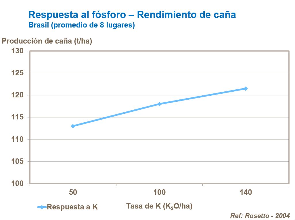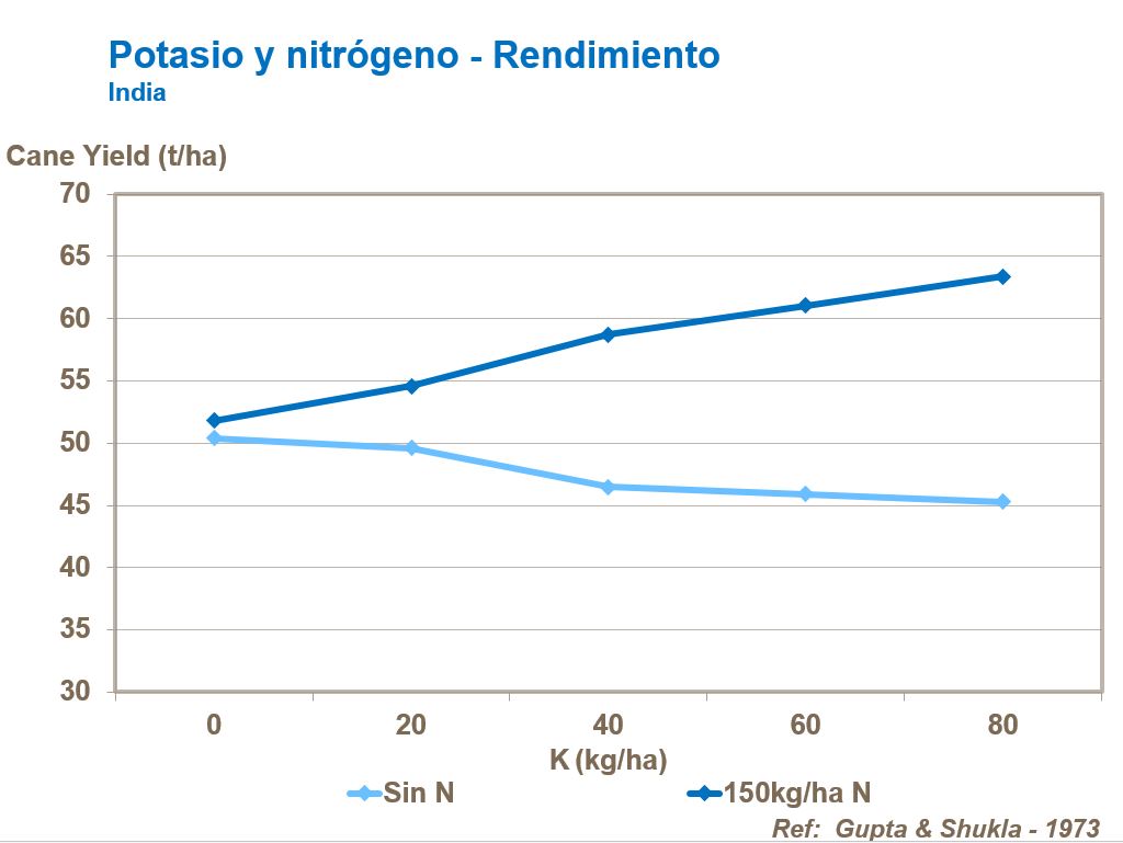 El potasio ayuda a la fotosíntesis y por eso es importante para crecimiento productivo, desarrollo más fuerte de tallos con menos encamado. Así, igual que el nitrógeno, Potasio también estimula fuerte desarrollo de caña, extendidos entrenudos, mayor circunferencia y rendimiento de la caña. Es importante que nitrógeno y potasio estén equilibrados. Mientras respuestas a N pueden ser pequeñas, el uso de potasio al mismo tiempo que nitrógeno asegura mejores rendimientos de caña de azúcar.