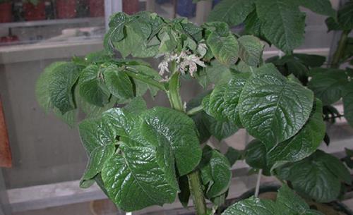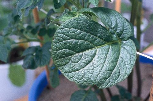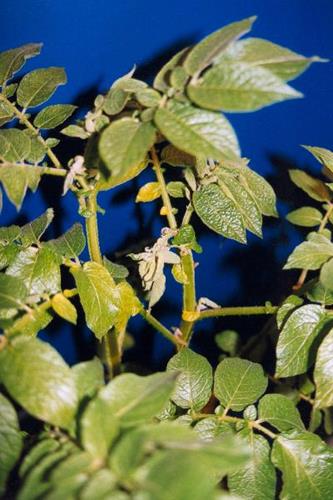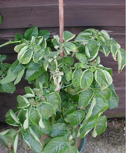 La planta entera palidece y amarillea, las hojas jóvenes son gruesas, se arrugan y se curvan hacia arriba. Mueren los ápices de crecimiento y las puntas de los brotes.