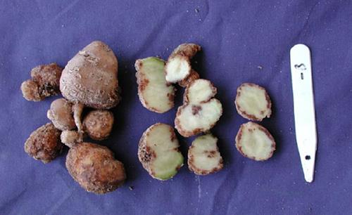 La deficiencia de B produce tubérculos pequeños con grietas en la piel y zonas marrones bajo la piel al final del estolón o en el anillo vascular.
