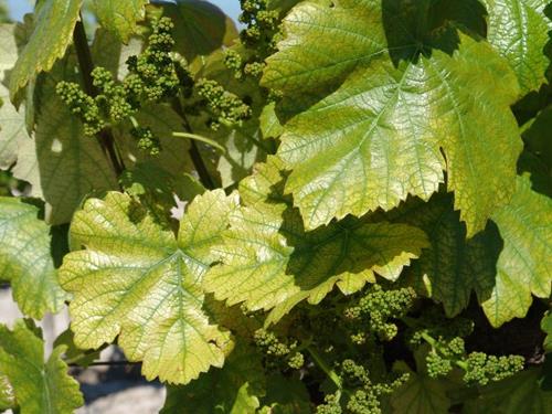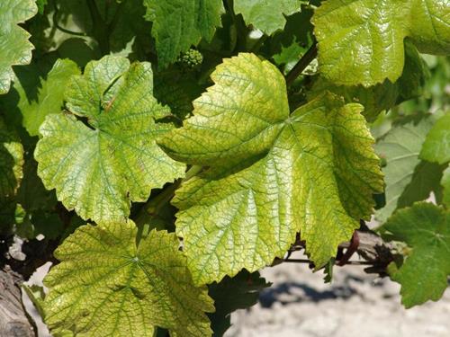 Los síntomas empiezan en hojas nuevas totalmente desarrolladas y en hojas de edad media. Presentan clorosis entre los nervios verde-amarilla. Los nervios y las venas pequeñas a lo largo de los nervios mantienen el color verde. En ocasiones tienen aspecto de mosaico, ya que todas las venas finas siguen siendo verdes.