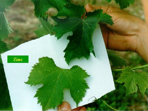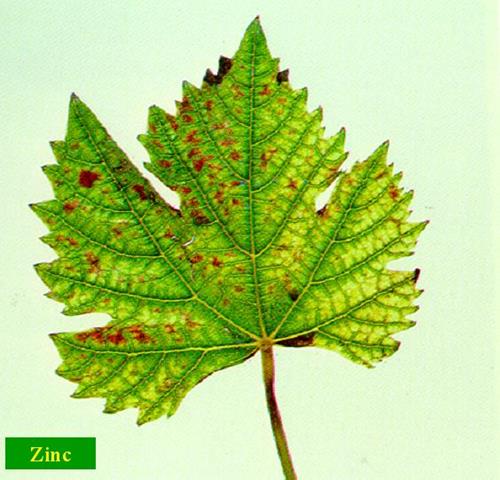 Los síntomas de la deficiencia de zinc aparecen primero en las hojas jóvenes. Aparece una clorosis en mosaico verde clara entre los nervios que va palideciendo a lo largo del tiempo. A lo largo de los nervios, se mantiene un borde verde oscuro.